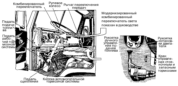Рукоятка утоплена — двигатель готов к пуску; для остановки двигателя вытяните рукоятку; - кран управления стояночным и запасным тормозами.