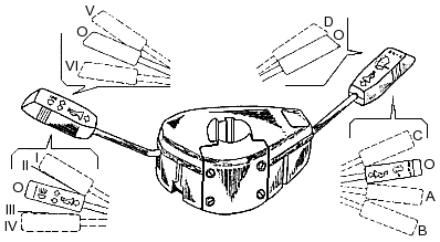 Рис. 2. Положения рычагов переключателя: I - включен указатель правого поворота; 0 - все выключено; II -включен указатель правого поворота (нефиксированное); А - первая скорость стеклоочистителя; III - включен указатель левого поворота (нефиксированное); В -вторая скорость стеклоочистителя; IV- включен указатель левого поворота; С - прерывистый режим работы стеклоочистителя; V - мигание дальним светом; D -включен стеклоомыватель (нефиксированное); VI -включен дальний свет