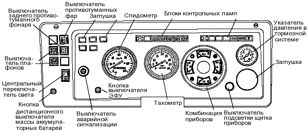 - выключатель освещения щитка приборов. Включает и регулирует степень освещенности приборов;